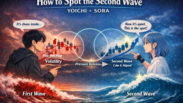 波の構造(技術編) 最も安全な波は第二波──その見つけ方 第一波の勢いに惑わされず、第二波の静けさを待つ──FXで最も安全なトレンドは、内部圧力が抜け、時間軸が揃う瞬間に点火する。図解で理解する第二波の構造とエントリー技術。 2026.04.04 波の構造(技術編)